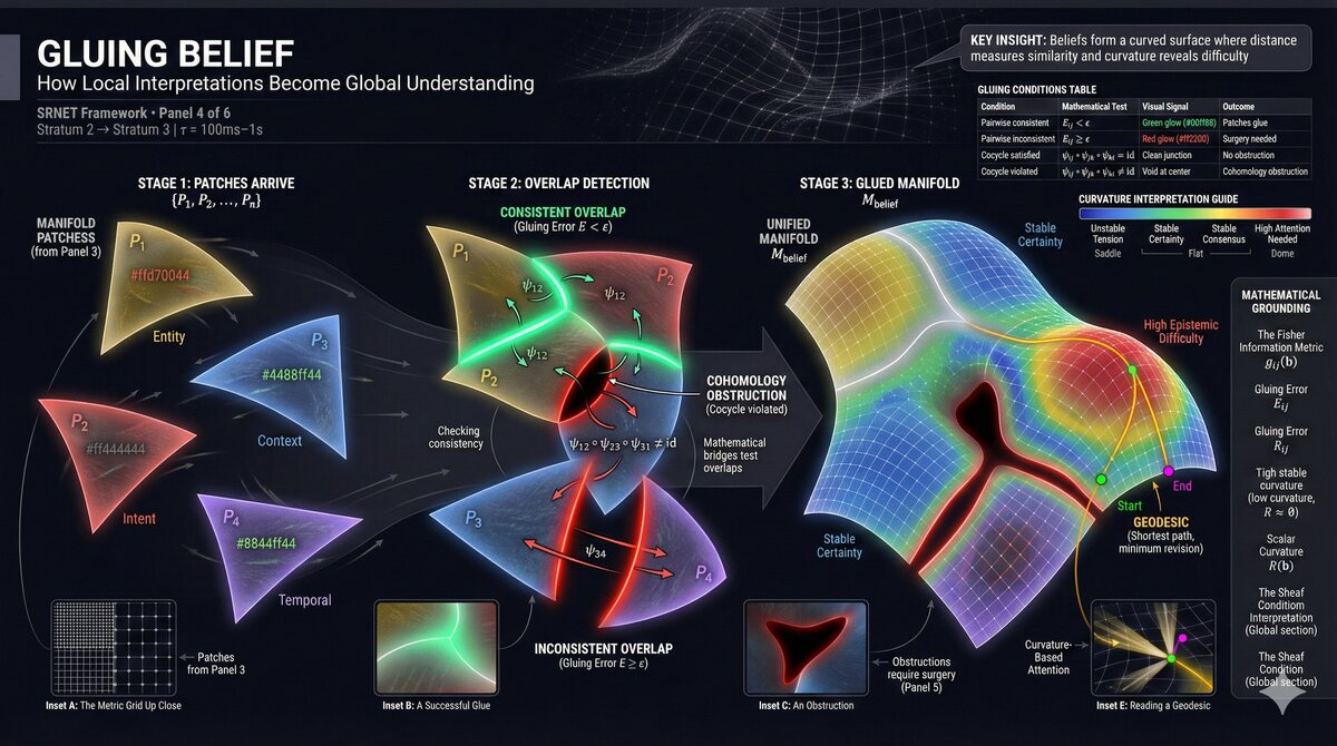 Multiple interpretation patches from different domains converge. Where they’re consistent, they glue smoothly into a larger coherent surface. Where they conflict, the geometry refuses to close.