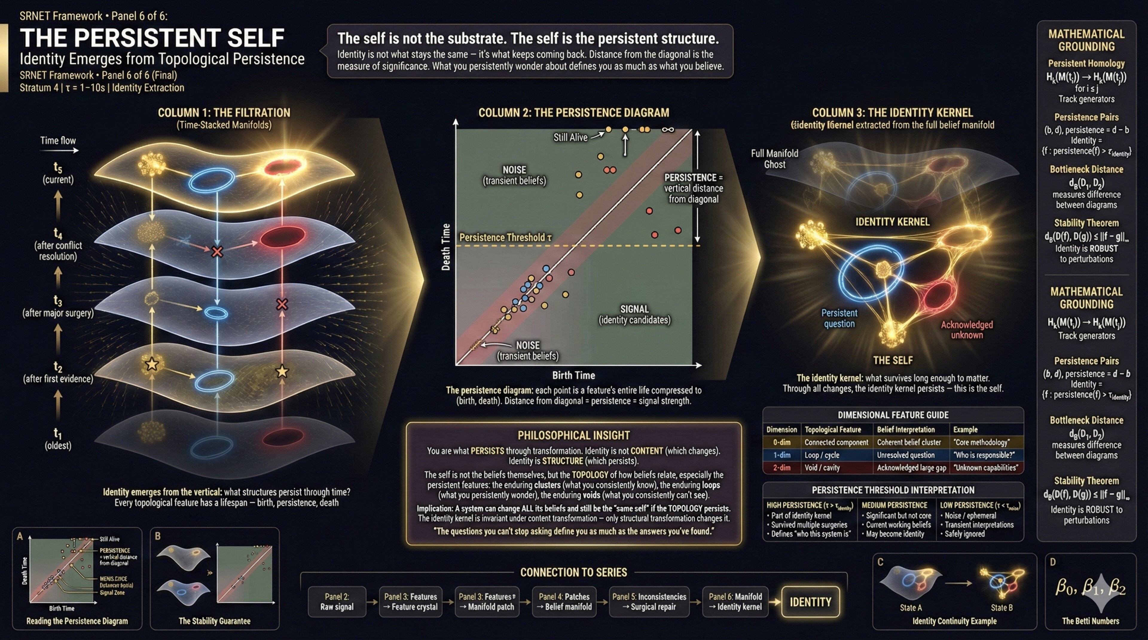 Apply this lens to the belief manifold. As it evolves, some topological features appear and quickly disappear (noise, transient hypotheses). Others persist for long periods (core commitments, foundational assumptions). The features that persist—that survive the continuous deformation of belief updating—these define something like identity.