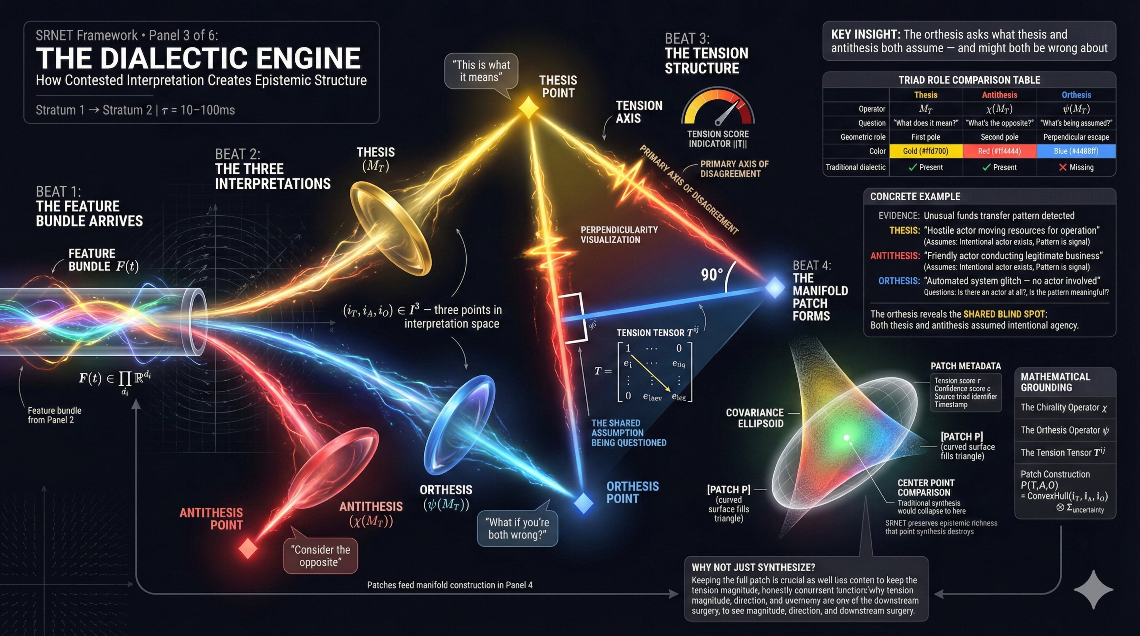 To ground the metaphor for ML readers: you can read “belief geometry” as the geometry of learned latent representations. A shared encoder produces embeddings; multiple interpretation heads (thesis/antithesis/orthesis) carve distinct regions; the “patch” is the region of latent space supported by their disagreement under a chosen metric (cosine, Mahalanobis, or information-geometric). The visuals hint at a neural architecture, but this article keeps the implementation intentionally light.