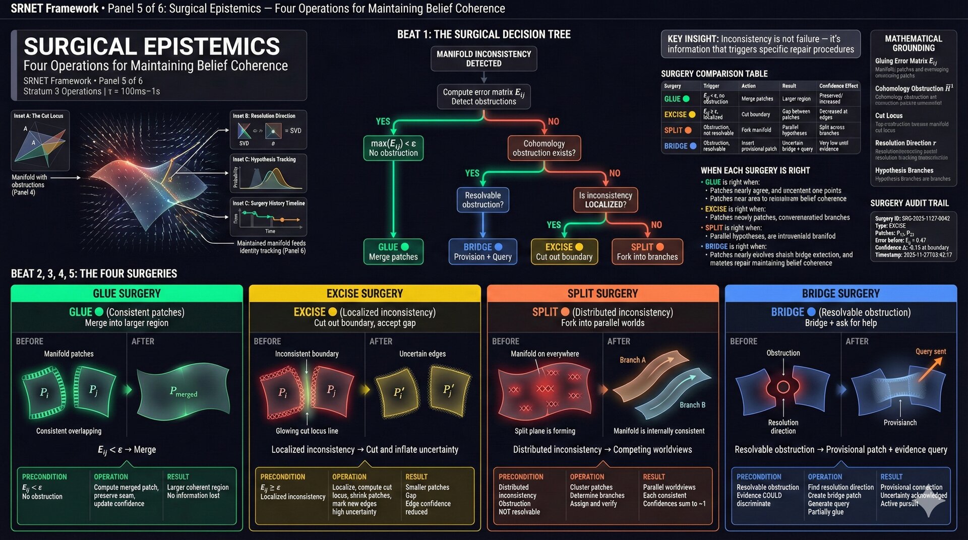 When patches can’t glue, surgery is required. Four responses to geometric obstruction: merge what matches, cut what conflicts, maintain parallel worlds, or bridge with uncertainty.