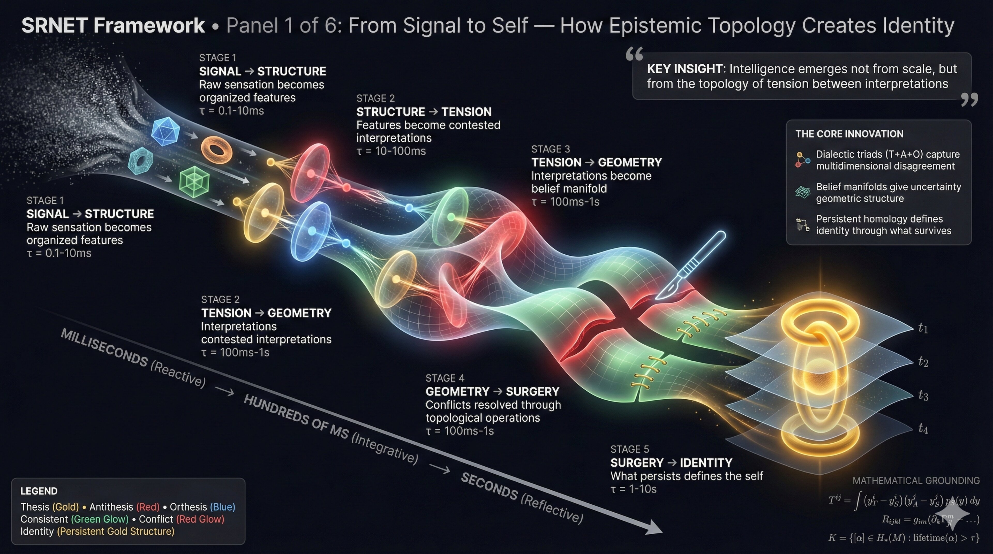 The answer proposed here is neither rigorous nor complete. It’s a visual language—a set of metaphors made geometric. Noise crystallizing into structure. Disagreement becoming triangles in a space. Patches gluing into manifolds. Surgery maintaining coherence. Topology defining identity.
