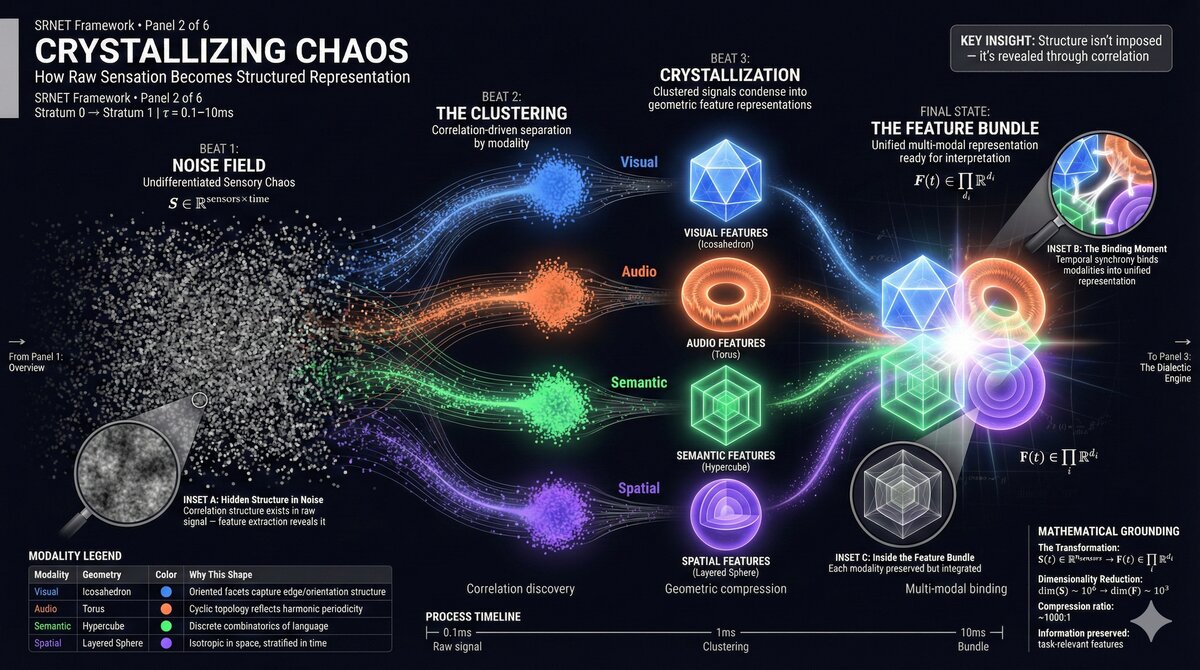- Signal → Structure: Raw chaos crystallizes into organized features